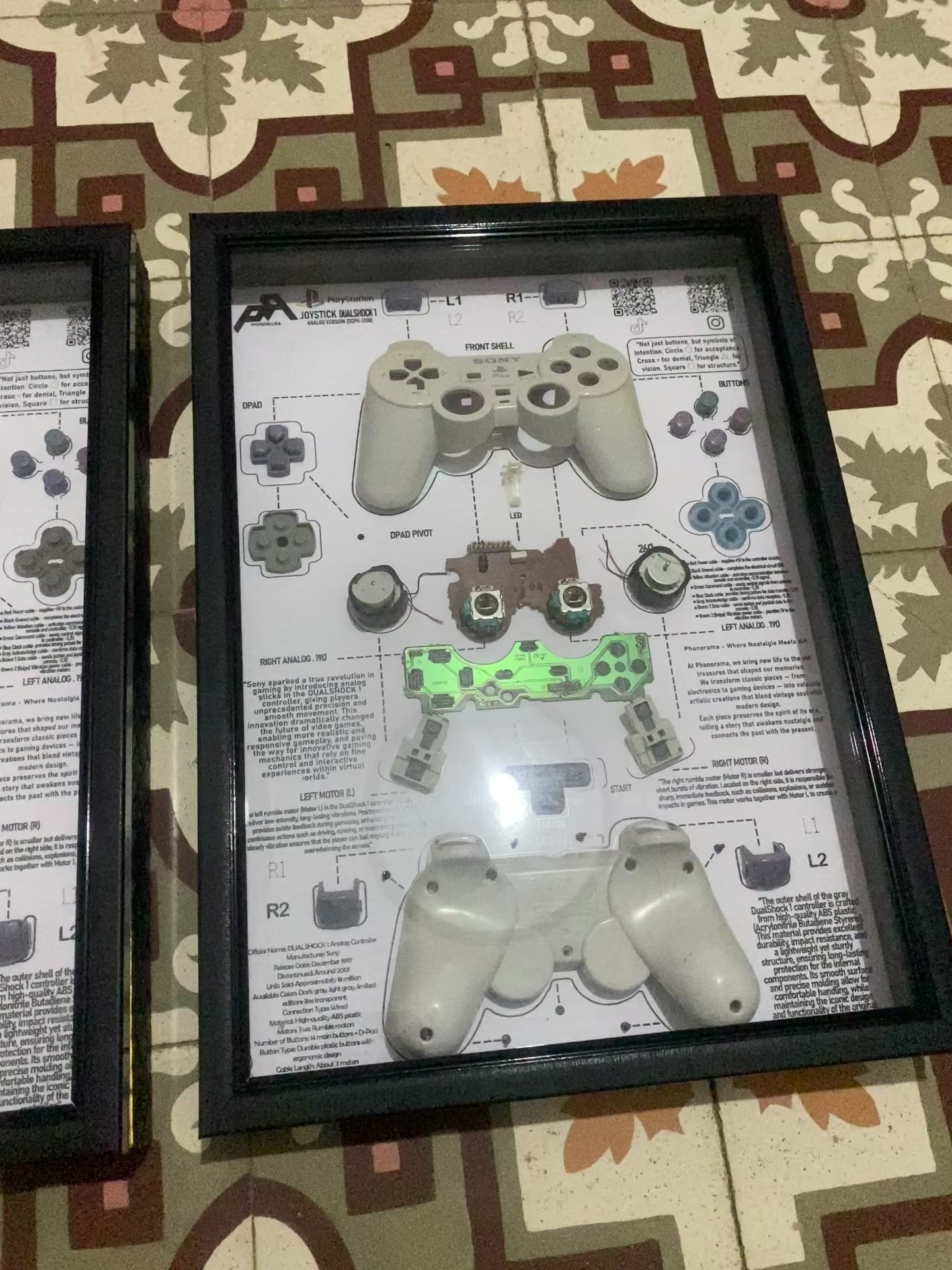 قطعة فنية تعيد لك ذكريات الطفولة وأيام البلايستيشن الكلاسيكي. كادر مصنوع من يد تحكم PS1 أصلية مُعاد تدويرها، ومثبتة داخل إطار أنيق يضفي لمسة فريدة على غرفتك أو محل الألعاب.